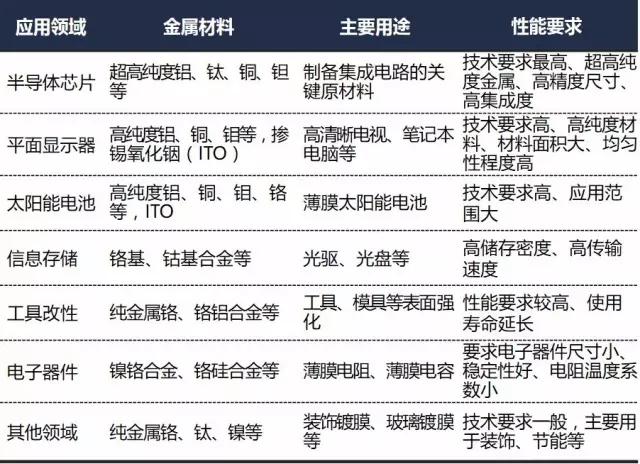 濺射技術(shù)作為薄膜材料制備的主流工藝,其應(yīng)用領(lǐng)域廣泛,如集成電路、平板顯示器、太陽(yáng)能電池、信息存儲(chǔ)、工具改性、光學(xué)鍍膜、電子器件、高檔裝飾用品等行業(yè)。高純?yōu)R射靶材則主要用于對(duì)材料純度、穩(wěn)定性要求更高的領(lǐng)域,如集成電路、平板顯示器、太陽(yáng)能電池、記錄媒體、智能玻璃等行業(yè)。