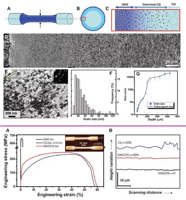 許多生物材料在局部化學(xué)組成或成分以及結(jié)構(gòu)特征上表現(xiàn)出空間梯度,這樣的空間梯度提高了生物材料的力學(xué)性能并賦予一定功能。為了優(yōu)化力學(xué)性能,梯度結(jié)構(gòu)被引入到金屬工程材料中。但在如何合成這種具有空間梯度的金屬材料,一直充滿著挑戰(zhàn)。從結(jié)構(gòu)的提出到實驗室的成功合成,該過程經(jīng)歷了10年之久。第一個成功合成梯度結(jié)構(gòu)金屬材料的是我國沈陽金屬研究所的盧柯院士,并將成果發(fā)表在了Science期刊上,繼而后來引發(fā)了全世界的科研浪潮。目前為止,合成梯度金屬材料的方法主要工藝主要為:a:表面機械摩擦處理(SMAT)是對板狀試樣進行表面機械摩擦處理的一種方法;b:表面機械磨削處理(SMGT)用于處理圓柱形樣品;c:表面機械軋制處理(SMRT)用于處理圓柱形樣品;d:高壓扭轉(zhuǎn)變形,是目前應(yīng)用最多的方法之一。這些方法造成的梯度誘導(dǎo)了孿晶,位錯以及層錯能的梯度。微觀的結(jié)構(gòu)差異改變了宏觀的力學(xué)性能(主要是非均勻的變形行為引起)。納米晶區(qū)強度大,粗晶區(qū)延性好,二者的協(xié)同作用促進了金屬材料的高強度和高延性。梯度晶體結(jié)構(gòu)是一種打破強塑性同時掣肘的很好地方法。TRIP和梯度結(jié)構(gòu)結(jié)合使得奧氏體鋼的塑性增加,但是強度維持不變。梯度結(jié)構(gòu)結(jié)合TWIP可以同時提高材料的強塑性。納米晶金屬塑性差的主要原因是缺乏加工硬化行為,從而導(dǎo)致早期應(yīng)變局部化和失效。梯度結(jié)構(gòu)可以抑制應(yīng)變局部化的早期發(fā)生。因為梯度結(jié)構(gòu)改變了變形機制,機械驅(qū)動納米晶粒生長。梯度結(jié)構(gòu)具有彈塑性均質(zhì)性和塑性非均質(zhì)性,從而形成宏觀應(yīng)變梯度。由于不兼容的變形,應(yīng)變梯度將單軸應(yīng)力轉(zhuǎn)變?yōu)槎噍S應(yīng)力。從粗粒度區(qū)域可以實現(xiàn)應(yīng)變?nèi)ゾ植炕蚝图庸び不?。因此,特殊的?yīng)力分布可能會增強位錯的形核和擴展,并導(dǎo)致額外的應(yīng)變硬化。梯度材料單軸變形柯分為三個階段:1)梯度晶體材料彈性變形;2)中心粗晶層開始變形,但是納米表面層仍然彈性變形;這種不相容性使單軸應(yīng)力轉(zhuǎn)變?yōu)殡p軸應(yīng)力;同時存在兩個彈塑性界面,并隨外加應(yīng)變的增加而向表面移動。出現(xiàn)應(yīng)力應(yīng)變梯度,形成協(xié)同強化和背應(yīng)力,提高屈服強度。3)粗晶層和納米晶層均可塑性變形,穩(wěn)定的頸縮首先發(fā)生在納米顆粒層中。然而,頸縮受到穩(wěn)定的粗粒度層的約束。頸縮層與中心穩(wěn)定層的界面附近出現(xiàn)陡峭的應(yīng)變梯度,通過必要的幾何位錯和背應(yīng)力的積累促進應(yīng)變硬化能力。此外,頸縮/穩(wěn)定界面從表面向中心層遷移,伴隨著高密度位錯的積累,提高了應(yīng)變硬化速率,從而提高了梯度晶材料的延性。在梯度結(jié)構(gòu)中,粗晶層中的位錯誘導(dǎo)硬化和納米層中的晶界遷移誘導(dǎo)軟化同時激活。巨大的應(yīng)變硬化能力主要來源于梯度層中由于不均勻變形產(chǎn)生的大量幾何必須位錯。梯度組織的應(yīng)變硬化速率可與粗晶組織相當。利用納米晶粒優(yōu)越的強度、粗大晶粒良好的塑性和梯度分布,實現(xiàn)了應(yīng)變?nèi)ゾ钟蚧皖~外應(yīng)變硬化,發(fā)展了強韌性材料。3.1 盧柯院士首次在《Science》雜志報道梯度銅該文是盧柯院士在國際上第一次合成梯度金屬材料并引起了國際間的極大關(guān)注與討論。該文一經(jīng)發(fā)表就引發(fā)了一股研究梯度材料的浪潮。通常納米金屬材料的強度很高,但是由于缺乏加工硬化行為,其塑性極差。該文通過表面塑性摩擦技術(shù)成功制備得了梯度銅,其顯微結(jié)構(gòu)為中心部位的粗晶層,越往表層晶粒越細,在距離表面深度為150um范圍內(nèi)存在納米梯度層。拉伸性能測試顯示合成的梯度銅具有10倍于粗晶銅的強度,其塑性基本保持不變。研究發(fā)現(xiàn)機械力驅(qū)動梯度層中晶粒的生長是主要的變形機理。這種變形機理導(dǎo)致梯度銅在具有高強度的同時還能維持很好的塑性。