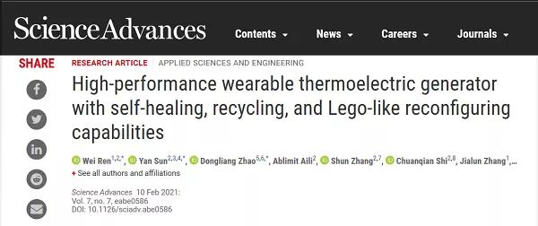 有鑒于此,華中科技大學楊榮貴教授研究團隊、美國科羅拉多大學肖建亮教授研究團隊、哈爾濱工業(yè)大學張麗霞教授研究團隊合作,在熱電器件研究領域取得重要突破。相關成果以“High-performance Wearable Thermoelectric Generator with Self-healing, Recycling and Lego-like Reconfiguring Capabilities”為題,于2月10日在線發(fā)表于Science Advances雜志上,被選為當期的首頁滾動推薦文章。哈爾濱工業(yè)大學的任偉博士和孫妍博士,以及東南大學的趙東亮教授為共同第一作者。