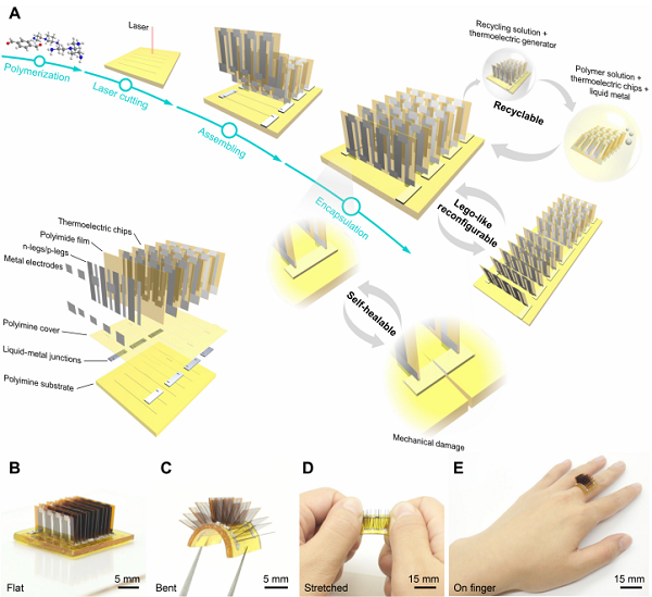 要點:模塊化的熱電片(Thermoelectric chips)插入到新型動態(tài)共價聚合物(Polyimine)基板上,通過液態(tài)金屬導線進行模塊間的電連接。