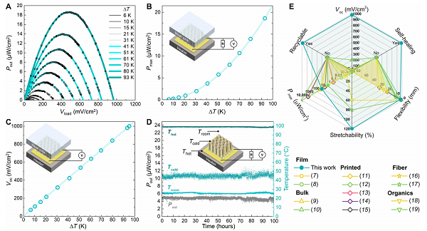 要點:1、95K溫差下開路電壓密度可達1V/cm2。熱端100℃下可以穩(wěn)定持續(xù)工作100小時。證明了在低溫廢熱(<100℃)回收應用下的優(yōu)異的輸出性能和可靠性。2、在開路電壓、輸出功率、柔性、拉伸性、自愈合和可循環(huán)等指標下具有顯著的綜合優(yōu)勢。