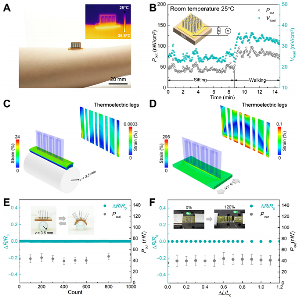 要點:1、在行走情況下,典型的運動腕帶大小的熱電器件可提供5V的開路電壓和12.5 μW的輸出功率,足夠直接驅(qū)動大部分低功率無線傳感器節(jié)點。2、器件在極端變形下,作為功能性部位的熱電材料上的應變量極低。因此在承受超過1000次3.5mm小半徑彎曲疲勞試驗以及120%拉伸變形后,輸出性能不發(fā)生任何衰減。