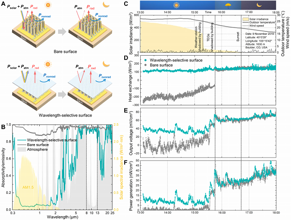 要點:波長選擇性超材料薄膜可以有效反射可見光,并且同時利用大氣透明窗口(8-13μm波段)實現(xiàn)空間輻射制冷,從而顯著提升戶外日間陽光直射條件下熱電器件的輸出。