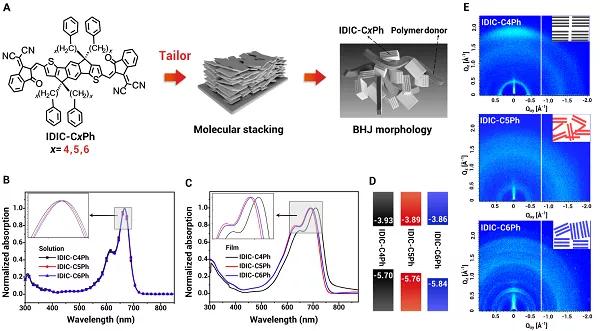 圖1. (A)材料設(shè)計與思路;(B-C)吸收光譜;(D)分子軌道能級;(E)GIWAXS二維圖
