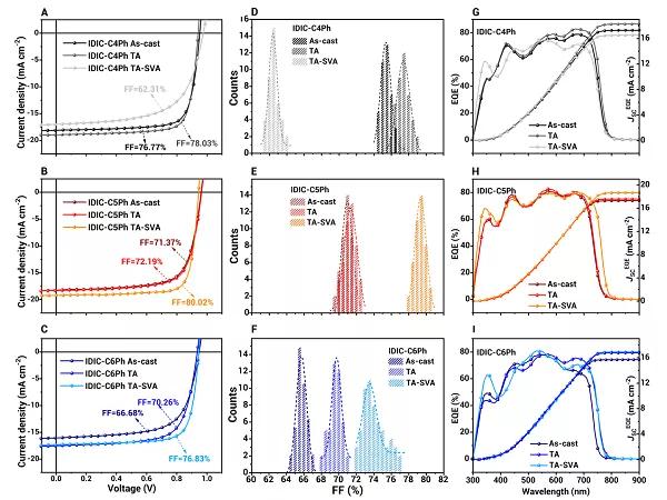 圖4. (A-C) J-V曲線;(D-F) FF值統(tǒng)計圖;(G-I) EQE曲線