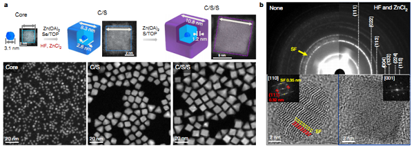 光學(xué)超表面開始進(jìn)入集成設(shè)備,可以增強(qiáng)和控制光波的發(fā)射、調(diào)制、動態(tài)整形和檢測。在這項研究中,三星先進(jìn)技術(shù)研究院&斯坦福大學(xué)發(fā)現(xiàn)有機(jī)發(fā)光二極管(OLED)顯示器的體系結(jié)構(gòu)可以通過引入納米圖案的超表面反射鏡而完全重新設(shè)想。 在最終的meta-OLED顯示器中,不同的metasurface圖案定義了紅色,綠色和藍(lán)色像素,并確保從有機(jī)白色發(fā)光體中優(yōu)化提取這些顏色。這種新的體系結(jié)構(gòu)有助于創(chuàng)建使用可縮放納米壓印光刻技術(shù)的新興顯示應(yīng)用(例如增強(qiáng)現(xiàn)實)所需的超高像素密度(每英寸> 10000像素)的設(shè)備。相對于標(biāo)準(zhǔn)的彩色濾光白色OLED,所制造的像素還具有兩倍的發(fā)光效率和出色的色純度。Metasurface-driven OLED displays beyond 10000 pixels per inch.(Science, 2020, DOI:10.1126/science.abc8530)2.三星先進(jìn)技術(shù)研究院Nature:高效穩(wěn)定的藍(lán)色量子點發(fā)光二極管