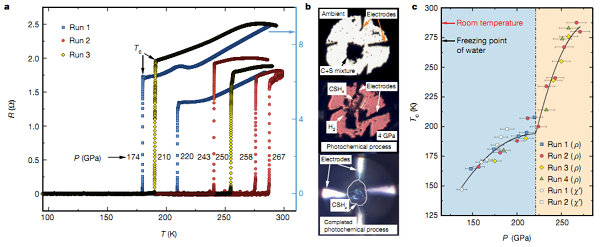 超薄二維(2D)半導(dǎo)體層狀材料為擴(kuò)展摩爾定律在集成電路中的晶體管數(shù)量提供了巨大的潛力。2D半導(dǎo)體的一個主要挑戰(zhàn)是避免從相鄰的電介質(zhì)形成電荷散射和捕獲位點。六方氮化硼(hBN)的絕緣范德華層提供了出色的界面電介質(zhì),有效地減少了電荷散射。最近的研究表明,在熔融金表面或塊狀銅箔上單晶hBN薄膜的生長。然而,由于熔融金的高成本,交叉污染以及過程控制和可擴(kuò)展性的潛在問題,因此不被工業(yè)所青睞。銅箔可能適用于卷對卷工藝,但不太可能與晶圓上的先進(jìn)微電子制造兼容。因此,可靠的直接在晶圓上生長單晶hBN薄膜的方法將有助于在工業(yè)中廣泛采用2D層狀材料。先前在Cu(111)金屬上生長hBN單層的嘗試未能實現(xiàn)單取向,當(dāng)這些層合并成flms時會導(dǎo)致有害的晶界。人們甚至認(rèn)為從理論上講,在諸如Cu(111)這樣的高對稱性表面上生長單晶hBN是不可能的。臺積電&臺灣陽明交通大學(xué)&萊斯大學(xué)報道了在兩英寸c面藍(lán)寶石晶片上的Cu(111)薄膜上成功完成了單晶hBN單層的外延生長。第一性原理計算結(jié)果證實了這一令人驚訝的結(jié)果,這表明通過hBN橫向?qū)又罜u(111)步驟可增強(qiáng)外延生長,從而確保hBN單層的單向性。所獲得的單晶hBN在底柵結(jié)構(gòu)中作為二硫化鉬和二氧化鉿之間的界面層并入,提高了晶體管的電性能。這種生產(chǎn)晶圓級單晶hBN的可靠方法為將來的2D電子學(xué)鋪平了道路。Wafer-scale single-crystal hexagonal boron nitride monolayers on Cu (111).(Nature, 2020, DOI:10.1038/s41586-020-2009-2)5.羅徹斯特大學(xué)&英特爾:氫化碳硫中的室溫超導(dǎo)