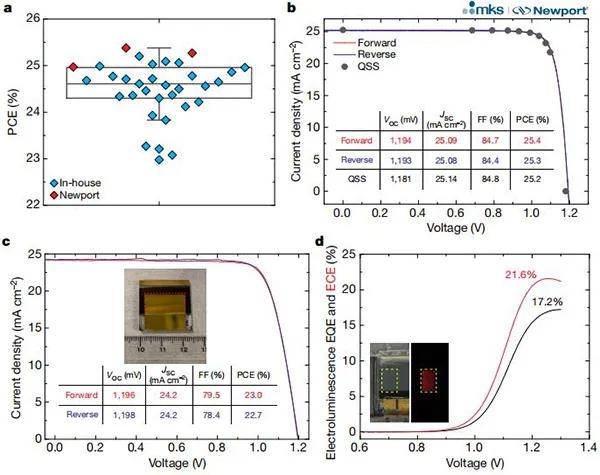 眾所周知,金屬鹵化物鈣鈦礦太陽能電池(PSCs)是一種新興的光伏技術(shù),具有打破成熟的硅太陽能電池市場的潛力。在過去的幾年里,由于制備方式,化學(xué)組成和相位穩(wěn)定方法的發(fā)展,器件性能有了很大的提高,使PSCs成為最有效和低成本的光伏技術(shù)之一。但是,這些器件的捕光性能仍然受到過多電荷載流子復(fù)合的限制。盡管付出了很多努力,但最佳的PSCs的性能還是受到相對較低的填充因子和高開路電壓缺陷的限制。電荷載流子管理的改善與填充因子和開路電壓密切相關(guān),因此為提高PSCs的器件性能并達(dá)到其理論效率極限提供了一條途徑。其中,基于SnO2的電子輸運層(ETLs)提供了有利的能帶對齊,同時能在低溫處加工。同時,在各種沉積方法中,基于SnO2納米顆粒的ETLs表現(xiàn)出了迄今為止最好的性能。但是,基于SnO2納米粒子的PSCs表現(xiàn)出相對較低的電致發(fā)光外部量子效率(EQE)。通過測量正向偏置下的發(fā)光效率確定的光伏器件的電致發(fā)光EQE是載流子復(fù)合輻射效率的直接度量。因此,至關(guān)重要的是開發(fā)出使ETLs/鈣鈦礦界面處的光電壓損失最小化的策略,使VOC最小化缺陷,從而研究者尋求另一種可以充分發(fā)揮SnO2 ETL潛力的沉積方法。鑒于此,麻省理工學(xué)院Moungi G. Bawendi,韓國化學(xué)技術(shù)研究所Jangwon Seo和Seong Sik Shin(通訊作者)報告了一種通過增強電荷載流子管理來提高PSCs性能的整體方法。首先,通過調(diào)整二氧化錫(SnO2)的化學(xué)浴沉積來開發(fā)具有理想膜覆蓋率,厚度和成分的電子傳輸層。其次,將鈍化策略在本體和界面之間解耦,從而改善了性能,同時使帶隙損失最小。研究表明,化學(xué)浴沉積過程中的Sn中間物在最終SnO2的質(zhì)量和特性中起著至關(guān)重要的作用層。更具體地講,各種Sn中間物質(zhì)的形成取決于Sn2+前驅(qū)體(SnCl2)的分解途徑,這取決于反應(yīng)溶液的pH。在正向偏置中,本文的器件顯示出高達(dá)17.2%的電致發(fā)光外量子效率和高達(dá)21.6%的電致發(fā)光能量轉(zhuǎn)換效率。作為太陽能電池,它們可實現(xiàn)25.2%的認(rèn)證功率轉(zhuǎn)換效率,相當(dāng)于其帶隙熱力學(xué)極限的80.5%。相關(guān)研究成果以“Efficient perovskite solar cells via improved carrier management”為題發(fā)表在Nature上。