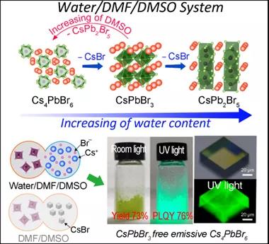 深圳大學(xué)微納光電子學(xué)研究院時(shí)玉萌課題組報(bào)道了水-DMF-DMSO三溶劑體系制備高質(zhì)量銫鉛溴鈣鈦礦的方法。該方法解決了強(qiáng)離子性的Cs離子在DMF/DMSO中難以溶解的問題。該方法可以不經(jīng)歷CsPbBr3中間相,而直接獲得高質(zhì)量的Cs4PbBr6熒光晶體,解決了傳統(tǒng)方法中Cs4PbBr6熒光晶體中內(nèi)嵌CsPbBr3納米晶的問題。所制備的Cs4PbBr6鈣鈦礦晶體的熒光產(chǎn)率達(dá)到76%,呈現(xiàn)出典型的幾何形狀依賴的熒光行為,與量子點(diǎn)的點(diǎn)狀熒光存在明顯的區(qū)別,明確了其綠色熒光更有可能來源于的Br-缺陷。