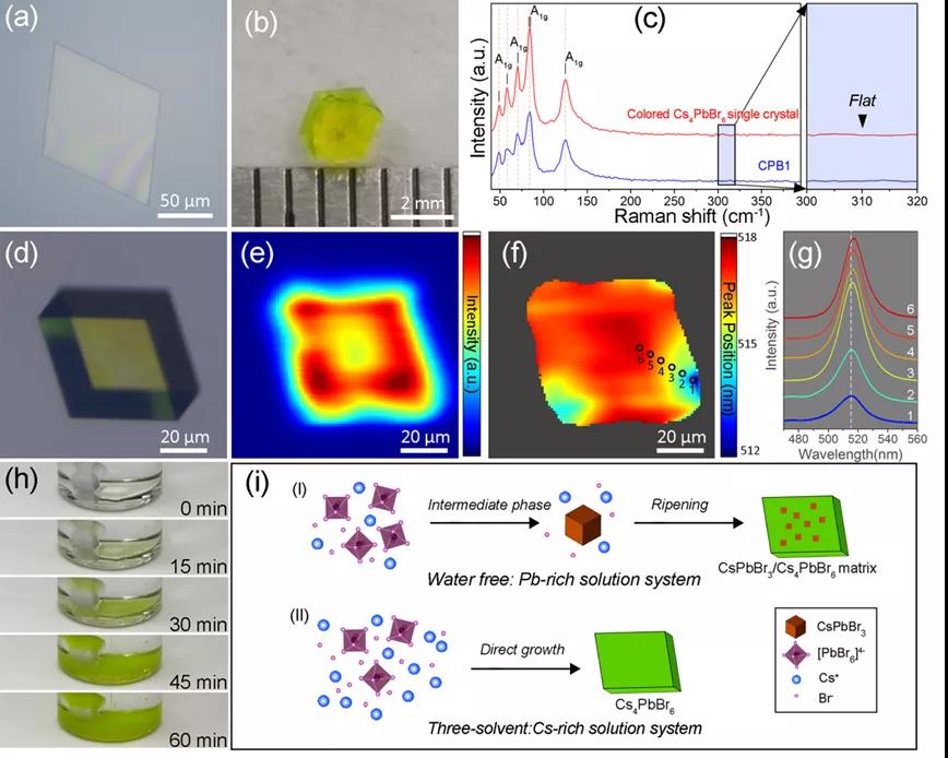 圖2. 三溶劑體系中水和DMSO量控制的銫鉛溴鈣鈦礦各相之間的互相轉(zhuǎn)化,以及室溫下隨水和DMSO相轉(zhuǎn)變的相圖。圖中CPB1,CPB2和CPB3分別為Cs4PbBr6,CsPbBr3和CsPb2Br5。圖3. a,b 三溶劑體系適用于合成不同尺寸,厚度的Cs4PbBr6晶體。c,拉曼測(cè)試證實(shí)所制備晶體內(nèi)部不存在CsPbBr3內(nèi)嵌雜質(zhì)。d,e,f,g Cs4PbBr6晶體的熒光Mapping測(cè)試,其發(fā)光存在幾何依賴的特點(diǎn)。h,i 三溶劑體系可以直接析出Cs4PbBr6晶體而不經(jīng)歷CsPbBr3中間相,因而,所獲得的體相晶體中避免了CsPbBr3雜質(zhì)的出現(xiàn)。
