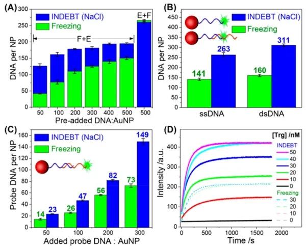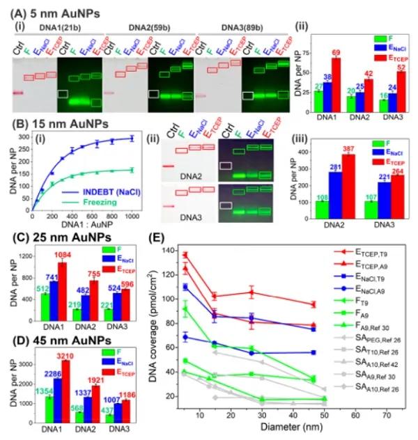 (E)不同方法制備的SNA的DNA修飾密度對(duì)比。