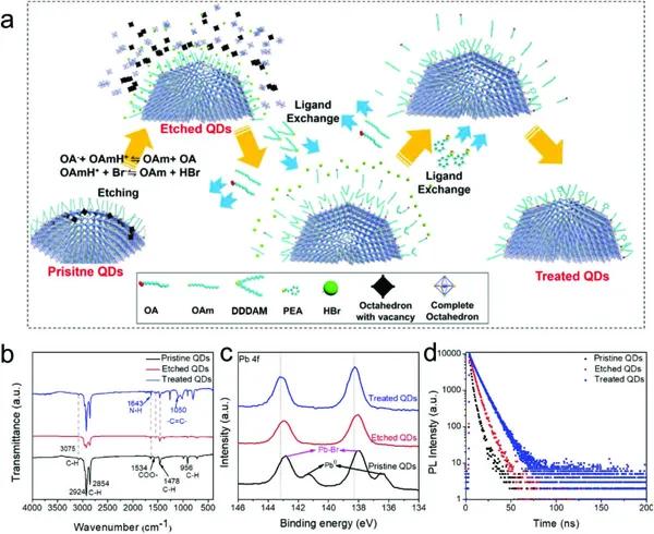 近日,北京科技大學(xué)田建軍教授(通訊作者)團(tuán)隊(duì)設(shè)計(jì)了一種新型的酸蝕驅(qū)動的配體交換策略,獲得了超低缺陷態(tài)密度和高穩(wěn)定性的純藍(lán)光(465 nm)、小尺寸(≈4nm)CsPbBr3鈣鈦礦量子點(diǎn)(QDs)。該策略是先使用酸溴化氫(HBr)來蝕刻不完美的[PbBr6]4-八面體,從而去除表面缺陷和過多的羧酸鹽配體。再先后引入十二烷基胺和苯乙胺來鍵合QDs剩余未配位的位點(diǎn),并與原有長鏈有機(jī)配體進(jìn)行原位交換,從而達(dá)到97%的量子熒光產(chǎn)率,而且其穩(wěn)定性得到顯著提高。基于該QDs的PeLEDs表現(xiàn)出純藍(lán)光的電致發(fā)光(470 nm)和EQE為4.7%。而且,其亮度為3850 cd m-2,這是迄今為止報(bào)道的純藍(lán)光PeLEDs的最高亮度。此外,該P(yáng)eLEDs還表現(xiàn)出強(qiáng)大的耐久性,在連續(xù)工作的情況下,半衰期超過12小時,這也是藍(lán)光PeLEDs當(dāng)前報(bào)道的最高值。該成果以題為“Perovskite Quantum Dots with Ultralow Trap Density by Acid Etching-Driven Ligand Exchange for High Luminance and Stable Pure-Blue Light-Emitting Diodes”發(fā)表在了Adv. Mater.上。