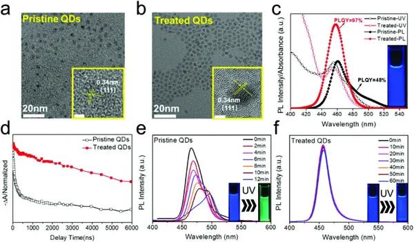 d)的瞬態(tài)吸收(TA,激發(fā)354 nm)漂白恢復(fù)曲線的演變,e)原始和f)處理的QDs在紫外線(UV)照射不同時間后的PL光譜。插圖:紫外線照射不同時間后的原始和經(jīng)過處理的量子點(diǎn)的照片。