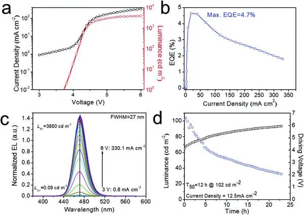 這項(xiàng)工作將酸蝕和配體交換結(jié)合起來,制備出高質(zhì)量的純藍(lán)色發(fā)光鈣鈦礦CsPbBr3 QDs。強(qiáng)酸性HBr蝕刻了具有空位缺陷的不完美八面體,并從QDs中去除多余的羧酸鹽配體。然后,通過短支鏈DDDAM鏈和PEA物種之間的配體交換過程,隨后與QDs表面形成強(qiáng)的L型配位作用。這一策略顯著提高了QDs的穩(wěn)定性,消除大量缺陷,獲得97%的量子熒光產(chǎn)率?;谠換Ds的PeLEDs表現(xiàn)出純藍(lán)光發(fā)射(470nm)和4.7%的EQE,符合NTSC和Rec.2020標(biāo)準(zhǔn),是一種理想的藍(lán)光發(fā)射。3850cd m-2的亮度和12小時的半衰期也是迄今為止所報(bào)道的純藍(lán)光PeLEDs的最高亮度和穩(wěn)定性表現(xiàn)。因此,這一策略為推動PeLEDs的發(fā)展和應(yīng)用提供了一種途徑。