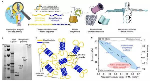 圖 7. 蛋白鏈結(jié)構(gòu)及其高級(jí)折疊結(jié)構(gòu)。魷魚蛋白質(zhì)的分析,魷魚啟發(fā)的主序列的設(shè)計(jì)以及蛋白質(zhì)庫的生物合成,產(chǎn)生了基于蛋白質(zhì)的功能性自修復(fù)材料,適用于軟促動(dòng)器和機(jī)器人應(yīng)用。b,天然Loligo vulgaris蛋白復(fù)合物和生物合成TRn4,TRn7,TRn11和TRn25多肽的蛋白大小。c,生物合成串聯(lián)重復(fù)多肽的納米結(jié)構(gòu)由通過柔性鏈(黃色)連接的β-片狀納米晶體網(wǎng)絡(luò)(藍(lán)色)組成,具有分子缺陷(懸空的末端和環(huán))。d,由于優(yōu)化的網(wǎng)絡(luò)形態(tài),魷魚啟發(fā)的蛋白質(zhì)(在室溫下)的自愈特性比天然蛋白質(zhì)得到的改善。誤差線,標(biāo)準(zhǔn)偏差(n = 5)。
