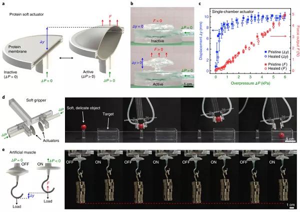 當(dāng)前的自修復(fù)材料具有限制其實(shí)際應(yīng)用的缺點(diǎn),例如低的治療強(qiáng)度(低于兆帕)和長的治療時(shí)間(小時(shí))。 針對這個(gè)問題德國馬普研究所的Melik C. Demirel和來自美國賓州州立大學(xué)的Metin Sitti團(tuán)隊(duì)基于魷魚腕足吸盤中的環(huán)狀齒蛋白序列,通過蛋白質(zhì)工程技術(shù),成功制備出了兼具高愈合后強(qiáng)度、超快愈合速度(愈合后強(qiáng)度達(dá)到2-23 MPa,愈合時(shí)間1s)和生物可降解的自愈合彈性體材料,并將這種材料用于制備氣動(dòng)人工肌肉和柔性抓手。這種材料可以在一秒鐘內(nèi)通過局部加熱自我修復(fù)微觀和宏觀機(jī)械損傷。并且經(jīng)過系統(tǒng)優(yōu)化,可以改善其氫鍵結(jié)合的納米結(jié)構(gòu)和網(wǎng)絡(luò)形態(tài),具有可編程的愈合特性,超過其他天然和合成軟材料的數(shù)量級(jí)。
