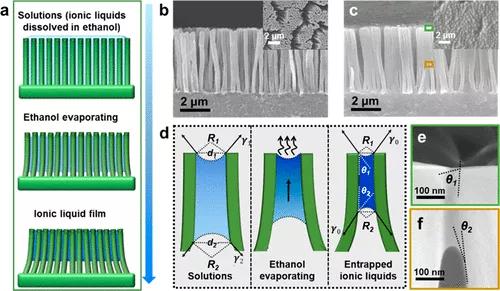圖9. 基于液膜的超耐用應(yīng)變傳感器的制造。(a)液膜的形成過程。(b,c)分別具有和不具有離子液體膜的微絨毛的橫截面SEM圖像。插圖:頂視圖SEM圖像。(d)分析驅(qū)動(dòng)力。(e,f)液膜頂部和底部的彎液面夾在微絨毛之間。