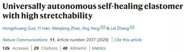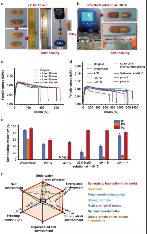 皮膚和肌肉在受到損傷時(shí)會(huì)自動(dòng)自我修復(fù),而這一能力一直是科學(xué)家夢寐以求想賦予材料的一種特殊性能。然而,目前的可修復(fù)材料的大多數(shù)設(shè)計(jì)都需要外部能量才能愈合或者這些材料的機(jī)械強(qiáng)度較弱。動(dòng)態(tài)超分子材料可以在一定程度上解決以上問題,它在室溫下無需外部條件便可以發(fā)生自我修復(fù)。但是,具有自修復(fù)性能的動(dòng)態(tài)超分子材料往往不能適用于極端條件,原因在于:(i)當(dāng)可修復(fù)材料在水下受傷或破裂時(shí),水分子會(huì)干擾動(dòng)態(tài)鍵的重新連接,導(dǎo)致材料無法修復(fù)。(ii)在凍結(jié)條件下,可修復(fù)材料中鍵的動(dòng)態(tài)特性遇到很大的障礙,從而極大地限制了自修復(fù)過程。(iii)一些自我修復(fù)的相互作用易受pH值變化的影響。針對以上問題,來自天津大學(xué)化工學(xué)院張雷教授團(tuán)隊(duì),通過在聚二甲基硅氧烷聚合物中協(xié)同結(jié)合多強(qiáng)度氫鍵和二硫鍵交換,設(shè)計(jì)出一種具有普遍自愈性和高拉伸性的超分子彈性體。它可以在極端條件下實(shí)現(xiàn)快速的自主自修復(fù),包括在室溫、超低溫(?40°C)、水下、過冷的高濃度鹽水(-10°C下30%NaCl溶液中)和強(qiáng)酸/堿環(huán)境(pH=0或14)。這些性質(zhì)歸因于動(dòng)態(tài)強(qiáng)氫鍵和弱氫鍵與強(qiáng)二硫鍵的協(xié)同相互作用。