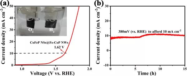 a)CoFeP NSs@Fe-CoP NWs樣品的極化曲線圖;b)CoFeP NSs@Fe-CoP NWs樣品在恒電位下的耐久性測試圖。該研究首次通過過飽和觸發(fā)維度和相控生長策略構(gòu)建2D/1D CoFeP NSs@Fe-CoP NWs異質(zhì)結(jié)構(gòu),且此催化劑表現(xiàn)出優(yōu)越的HER,OER和全水解電催化性能。該合成策略能夠用于設(shè)計(jì)具有優(yōu)異的多功能電催化性能的2D/1D磷化物異質(zhì)結(jié)構(gòu)催化劑,也將為推進(jìn)能源相關(guān)應(yīng)用的多維納米結(jié)構(gòu)開辟另一種途徑。