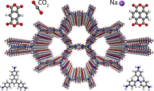 共價有機框架是一類新興的材料家族,具有多種潛在的應用價值。它們的多孔框架和氧化還原特性的活性中心具有氣體/離子吸附特性,使其成為下一代電池中安全、廉價和可控的電極材料,以及碳捕獲中的CO2吸附材料。通過將芳香族三胺與芳香族二酐結合,發(fā)展了四種聚酰亞胺COFs,并進行了細致的結構和電化學表征。通過DFT計算和粉末XRD的結構表征,顯示酰亞胺鍵傾向于以一定角度形成,從而破壞了二維對稱性,縮小了孔徑并拉長了孔壁。兩種性能最佳的COFs源自相同的三胺結構單元,結合力場計算,揭示了意想不到的結構-性質(zhì)關系。特定的幾何形狀為鈉離子嵌入提供了有用的框架,在相對較高的工作電位(> 1.5 V vs Na/Na+)下具有可保持的容量和穩(wěn)定的循環(huán)壽命。盡管與傳統(tǒng)的無機鋰離子材料相比,這種容量還較低,但這些COFs由于具有不溶于水的特性,在可持續(xù)、安全和穩(wěn)定的水系鈉離子電池中具有優(yōu)勢。