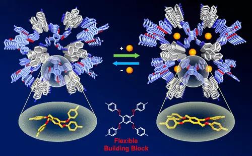 三維共價有機框架(3D COFs)的構建是非常困難的,因為它們的合成驅(qū)動力主要來自共價鍵的形成。為了便于合成,剛性結構單元始終是設計3D COFs的首選。原則上,用柔性的單元構建3D COFs應該很有吸引力,但是此類系統(tǒng)的發(fā)展遇到了瓶頸,尤其是在設計合成和結構確定方面。這項成果報道了一種新型的高度結晶的3D COF (FCOF-5),在結構基元主鏈中具有柔性的C–O單鍵。有趣的是,F(xiàn)COF-5是柔性的,在蒸汽吸附/解吸時發(fā)生可逆的膨脹/收縮,表明存在呼吸運動。進一步制備了一種具有FCOF-5結構的智能軟聚合物復合膜,該復合膜具有可逆的蒸汽觸發(fā)相變。因此,由柔性單元構建的3D COFs可以表現(xiàn)出有趣的呼吸行為,這種柔性多孔晶體將具有多種有趣特性。