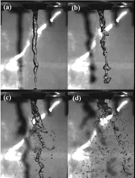 高速攝影拍攝的結(jié)果可保存為視頻文件,利用 Adobe Premiere Pro 軟件,可將視頻中每一幀圖像提取出來,選擇其中典型的霧化圖像可以對(duì)霧化過程進(jìn)行分析。以氣體壓力為1.7MPa, 液體流量為 60L/h 為例, 提取出一系列圖片, 如圖 4所示。