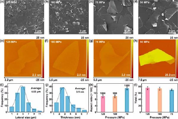 不同施加壓力下制備的BNNS的(a–d) SEM及(e–h) AFM圖像。(i) 75 MPa施加壓力下制備的BNNS的橫向尺寸和(j)厚度分布統(tǒng)計。(k) BNNS的縱橫比和及(l)產(chǎn)率與施加壓力之間的關系。