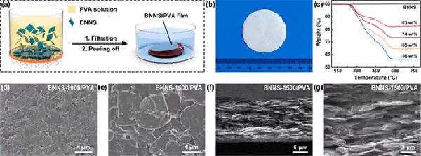 (a)抽濾制備BNNS/PVA復合薄膜的過程示意圖。(b)復合薄膜實物照片及其(c) TGA曲線。83 wt%含量下(d) BNNS-1000/PVA和(e–g) BNNS-1500/PVA的表面和橫截面SEM圖像。