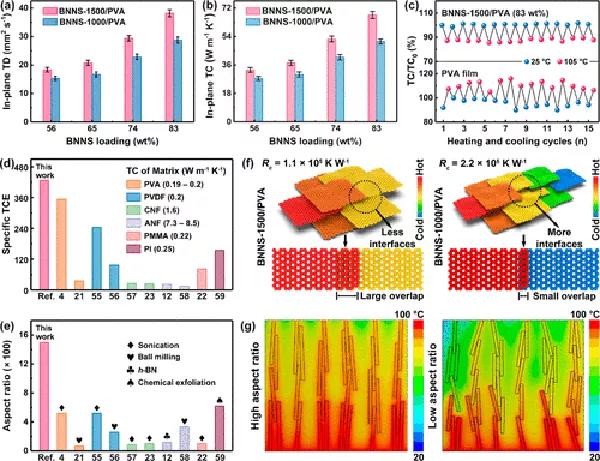復合薄膜的(a)面內(nèi)熱擴散系數(shù)和(b)熱導率與BNNS長徑比及含量之間的關系。(c) BNNS-1500/PVA (83 wt%)的冷熱循環(huán)測試(d)樣品與文獻中報道的氮化硼基復合材料的比TCE值比較,以及(e)上述復合材料所使用的填料長徑比對比。(f)大長徑比BNNS聲子傳輸優(yōu)勢的機理解釋及(g)基于有限元分析的大小長徑比BNNS傳熱能力的對比。
