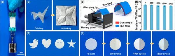 83 wt%含量下BNNS-1500/PVA復合薄膜具有(a)良好的機械強度和(b)高度可折疊性,(c)易于裁切成型。(d)循環(huán)彎曲試驗及其相應的(e)形貌和(f)面內(nèi)導熱率變化。