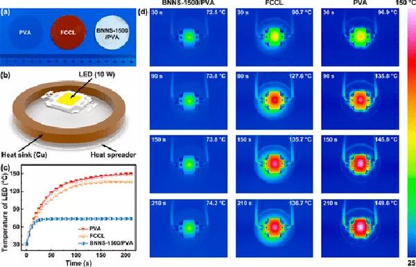(a) PVA、FCCL和本樣品的實物照片。(b)實際散熱測試的實驗系統(tǒng)設置。(c)使用不同薄膜作為勻熱膜時LED芯片的中心溫度隨運行時間的變化,及其(d)相應的IR圖像。