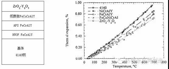 有的多層結(jié)構(gòu)通過采用多種成分涂層來滿足一種性能要求,例如,為了開發(fā)出能夠滿足柴油發(fā)動(dòng)機(jī)用的長壽命厚熱障涂層,Robert等采用了熱膨脹系數(shù)非常接近的三層結(jié)合底層來降低涂層熱應(yīng)力,其涂層結(jié)構(gòu)如圖所示,各層涂層的熱膨脹行為如右圖所示。由于基體材料4140、NiCrAlY、FeCrAlY、FeCoNiCrAl和ZrO2-Y2O3之間膨脹系數(shù)屬于逐漸變化的,從而可以大幅度減小ZrO2-Y2O3涂層與基體之間的熱膨脹不匹配性,從而達(dá)到減小熱應(yīng)力、延長使用壽命的目的。