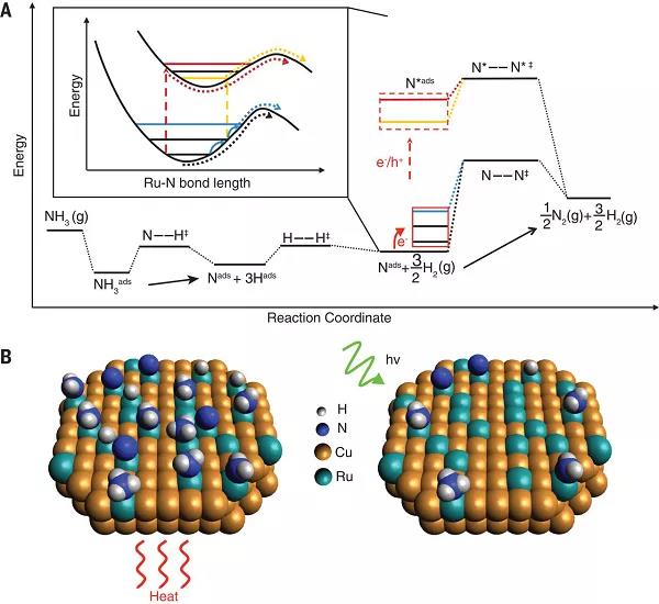 在以等離子體金屬納米顆粒為代表的催化劑發(fā)揮光熱催化效果時(shí),產(chǎn)生熱電荷載流子可活化反應(yīng)物、并降低反應(yīng)的總能壘。然而,在這過(guò)程中的熱和電子激發(fā)的關(guān)系尚不清楚。針對(duì)這一問(wèn)題,萊斯大學(xué)的Peter Nordlander和Naomi J. Halas[3]等人通過(guò)研究氨氣分解來(lái)分析光和熱激發(fā)的作用。在銅合金納米構(gòu)造中,通過(guò)吸收光產(chǎn)生電子可活化在釕表面原子上的氮原子。通過(guò)測(cè)量不同波長(zhǎng)、光強(qiáng)和催化劑表面溫度下的反應(yīng)速率,可以定量表觀活化能壘,厘清熱載流子的作用,并為設(shè)計(jì)高效光催化劑奠定了基礎(chǔ)。