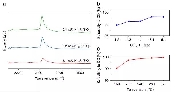 近期,中山大學(xué)匡代彬教授和多倫多大學(xué)Geoffrey A. Ozin教授(共同通訊作者)首次報(bào)道了金屬磷化物可作為一種高活性、選擇性、穩(wěn)定性的光催化二氧化碳加氫催化劑。研究以磷化鎳(Ni12P5)為原型,這一磷化物的結(jié)構(gòu)建立在將高分散鎳納米簇集成到磷晶格中的基礎(chǔ)上,可以在整個(gè)太陽(yáng)光光譜范圍高度富集光能。由于該化合物具有獨(dú)特的線性鍵合的鎳-羰基占主導(dǎo)的反應(yīng)路徑,磷化鎳被發(fā)現(xiàn)是一種光熱催化劑,可實(shí)現(xiàn)逆水煤氣變換反應(yīng),一氧化碳的生產(chǎn)速率為960?±?12?mmol?gcat?1?h?1,選擇性近乎100%,同時(shí)還具有長(zhǎng)期穩(wěn)定性。不僅如此,磷化鈷也被發(fā)現(xiàn)具有相似的特性,這說(shuō)明金屬磷化物可作為具有高速率和選擇性的光熱二氧化碳催化劑。