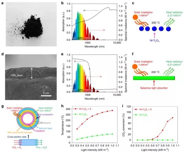 河北大學(xué)的李亞光、王淑芳和浙江師范大學(xué)的胡勇、日本國(guó)立物質(zhì)材料研究所葉金花(共同通訊作者)得益于添加可以同時(shí)吸收太陽(yáng)光全譜和產(chǎn)生熱輻射的選擇性光吸收劑,制造了新型光熱轉(zhuǎn)換器件,可以吸收95%的太陽(yáng)光,熱輻射僅為報(bào)道吸光材料的1/10,能夠在標(biāo)準(zhǔn)太陽(yáng)光輻照下產(chǎn)生288 °C的高溫,是傳統(tǒng)吸光材料的三倍以上,可實(shí)現(xiàn)標(biāo)準(zhǔn)太陽(yáng)光驅(qū)動(dòng)下的二氧化碳甲烷化光熱化。不僅如此,他們還制備了負(fù)載單原子鎳的非晶Y2O3二維納米片,作為高效甲烷化催化劑。在選擇性吸光劑光熱器件和負(fù)載型非晶Y2O3二維納米片的協(xié)同作用下,實(shí)現(xiàn)了室外太陽(yáng)光(0.52到0.7個(gè)標(biāo)準(zhǔn)太陽(yáng)光強(qiáng)度)輻照的高效二氧化碳甲烷化,其轉(zhuǎn)化效率和甲烷產(chǎn)率可分別達(dá)到80%和7.5 l m?2 h?1。