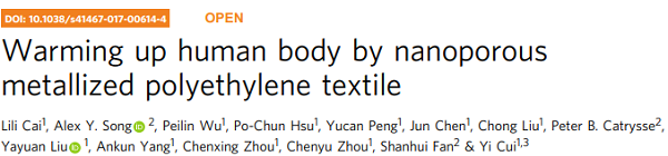3. 斯坦福大學(xué)崔屹Nat. Commun.: 保溫利器-納米多孔金屬化聚乙烯織物