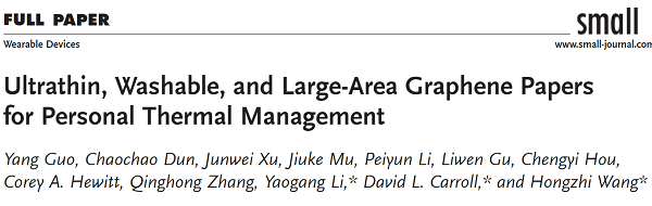 5. 維克森林大學(xué)David Carroll &東華大學(xué)王宏志Small封面: 用于個人熱管理的超薄、可水洗和大面積石墨烯紙