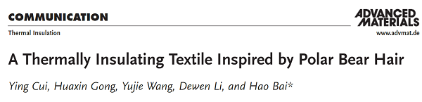 A Thermally Insulating Textile Inspired by Polar Bear Hair. Adv. Mater. 30, 1706807 (2018). https://doi.org/10.1002/adma.201706807.
