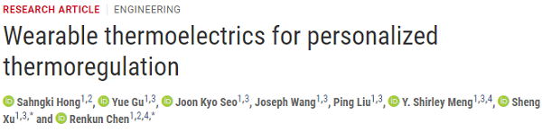 7. 加州大學(xué)圣地亞哥分校陳仁坤&徐升Sci. Adv.: 用于個性化溫度調(diào)節(jié)的可穿戴熱電設(shè)備