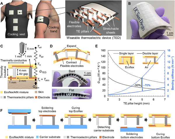 體溫調(diào)節(jié)對能量消耗以及人類舒適和健康具有重要的影響。然而,一個多世紀以來,冷卻技術(shù)基本保持不變,而且無論居住人數(shù)的多少,仍然依賴于對整個空間進行制冷。熱電裝置(TED)的個性化溫度調(diào)節(jié)可以顯著減少冷卻量并滿足個性化的冷卻需求,但由于缺少具有可持續(xù)的高冷卻性能的柔性TED,目前還沒有實現(xiàn)。本文中,加州大學(xué)圣地亞哥分校陳仁坤&徐升等研究者展示了一種可穿戴TED,它可以提供超過10 °C的冷卻效果,并具有高性能系數(shù)(COP > 1.5)。由于在雙彈性體之間加入剛性無機高熱電優(yōu)值(ZT)的熱電(TE)柱,以及空氣絕緣絕熱層的新穎設(shè)計,該TED是第一個實現(xiàn)長期高柔性主動冷卻的產(chǎn)品。此外,該TED在沒有使用其他散熱器的情況下,可以達到10 ℃以上的降溫效果。該研究還將TED集成到了一件可穿戴的衣服中,展示了其對人體皮膚的長期、節(jié)能的降溫和加熱效果,研究結(jié)果表明:當環(huán)境溫度在22 ℃到36 ℃之間變化,該衣物可保持人體皮膚在32 ℃的舒適溫度。與傳統(tǒng)的集中空間冷卻方式相比,TED自動化的冷卻能力為個性化冷卻提供了巨大的節(jié)能潛力,從而在提高人體舒適度的同時大大降低能源消耗。