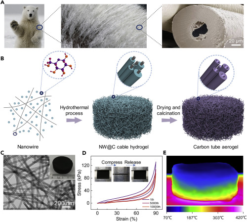 北極熊中空、輕質(zhì)且不可潤濕的毛發(fā)有助于其抵御極端寒冷的環(huán)境。受北極熊毛發(fā)微觀結(jié)構(gòu)的啟發(fā),中科大俞書宏院士團隊采用一維納米線作為模板,通過模板法制備宏觀尺度的具有超彈性和出色隔熱性能的輕質(zhì)碳管氣凝膠(CTA),這種材料具有了北極熊毛發(fā)的所有優(yōu)點,包括輕質(zhì)、防水和隔熱性。這種由中空碳纖維管組成的CTA重量輕,最低密度僅為8 kg/m3,并且具有146 °接觸角的優(yōu)異防水性能。同時,CTA 的最低熱導(dǎo)率僅為 23 mW·m-1·K-1,優(yōu)于干燥空氣。值得注意的是,仿生 CTA 材料顯示出比北極熊毛更好的超彈性和抗疲勞性,優(yōu)化后的氣凝膠可以在 30% 應(yīng)變下超過 100 萬次壓縮-釋放循環(huán)和 90% 應(yīng)變下超過 10,000 次循環(huán)后保持結(jié)構(gòu)完整性。通過標準鋼球下落測試,其回彈速度達1,434 mm/s,進一步證實了其超彈性。這種碳管氣凝膠宏觀合成的仿生設(shè)計為未來設(shè)計高性能輕質(zhì)、超彈性和隔熱材料打開了一扇窗,可廣泛應(yīng)用于仿生工程材料領(lǐng)域,如建筑、 航天等。