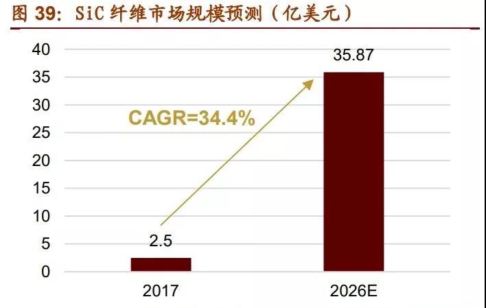 據(jù)不完全統(tǒng)計(jì),2015 年全球連續(xù)碳化硅纖維的總產(chǎn)量達(dá) 300 噸。未來幾年,隨著美日 主要生產(chǎn)商進(jìn)一步擴(kuò)產(chǎn),中國、中東生產(chǎn)商入局,預(yù)計(jì)世界碳化硅纖維總產(chǎn)量至 2025 年有望增長至 500 噸左右。根據(jù) Stratistics MRC 預(yù)測(cè),SiC 纖維市場(chǎng) 2017 年的估值為 2.5 億美元左右。隨著 SiC 纖維的研究工作不斷深入、使用場(chǎng)景逐步增加,其市場(chǎng)需求 有望快速擴(kuò)大。預(yù)計(jì)到 2026 年 SiC 纖維的市場(chǎng)規(guī)模將增長至 35.87 億美元,復(fù)合年增 長率將達(dá)到 34.4%。SiC 下游最主要的應(yīng)用之一是 CMC 材料,根據(jù) MarketsandMarkets 預(yù)測(cè),2021 年全 球 CMC 材料市場(chǎng)的市場(chǎng)規(guī)模達(dá)到 88 億美元。未來十年,伴隨著綜合國力的增強(qiáng)以及 國際形勢(shì)的不確定性,以中國為代表的主要發(fā)展中國家有望加大航空航天領(lǐng)域的投入力 度,對(duì)新一代的航空器及航空發(fā)動(dòng)機(jī)的需求有望大幅提升。在此背景下,憑借輕量化、 高耐熱、抗氧化的顯著優(yōu)勢(shì),SiC 纖維復(fù)合陶瓷基材料(CMC 材料)的使用率有望大幅增長。