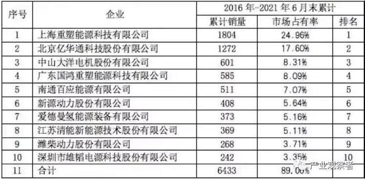 表1 2016年-2021年6月國內(nèi)燃料電池企業(yè)累計(jì)銷量排名