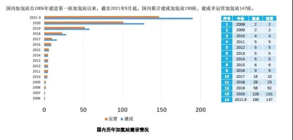 直到2018年,才逐步有了第三方的加氫站,目前,中石化已經(jīng)成為國內(nèi)加氫站的主力,據(jù)統(tǒng)計(jì)截至2021年9月底,國內(nèi)累計(jì)建成加氫站190座,其中147座已經(jīng)投入運(yùn)營(yíng)。