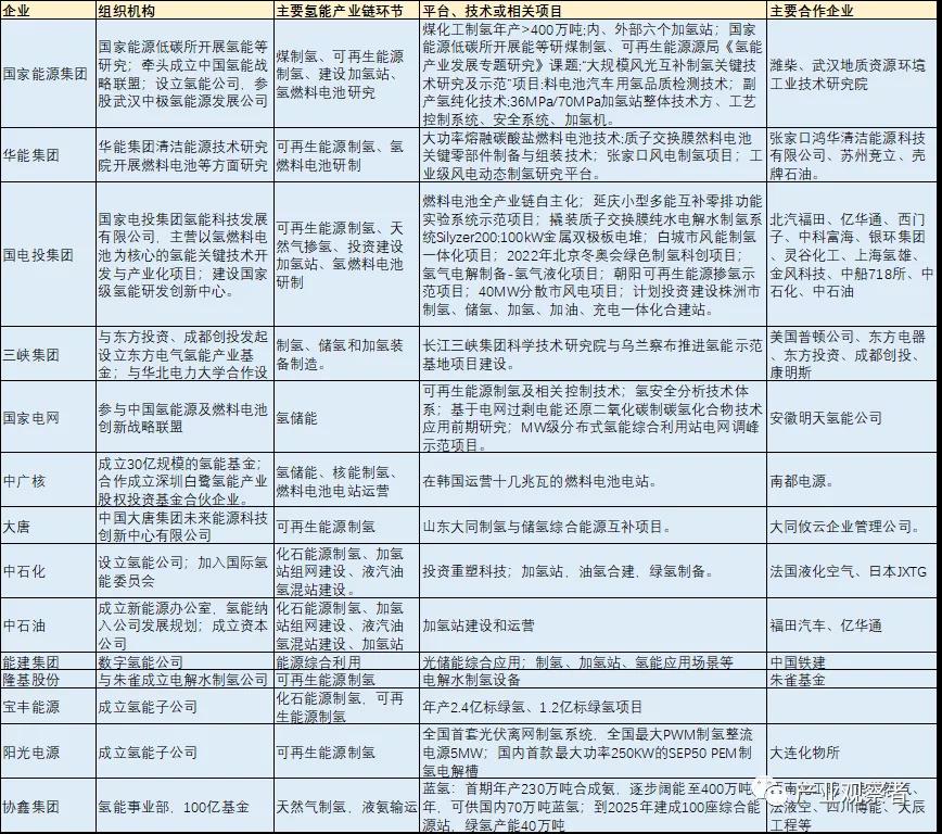 氫氣被納入能源體系的同時(shí),“碳達(dá)峰,碳中和”目標(biāo)使得大型能源企業(yè)和工業(yè)企業(yè)面臨現(xiàn)實(shí)的排放壓力,相關(guān)能源企業(yè)紛紛布局氫能,今年7月16日,國資委秘書長(zhǎng)彭華崗曾經(jīng)表示,超過三分之一的中央企業(yè)已經(jīng)布局氫能。目前,國家能源集團(tuán)、華能集團(tuán)、國電投集團(tuán)、三峽集團(tuán)、國家電網(wǎng)、中廣核、大唐、中石化、中石油、能建集團(tuán)等能源企業(yè)都在氫能上做了大量的研發(fā)投入,并進(jìn)入大規(guī)模項(xiàng)目的示范階段。