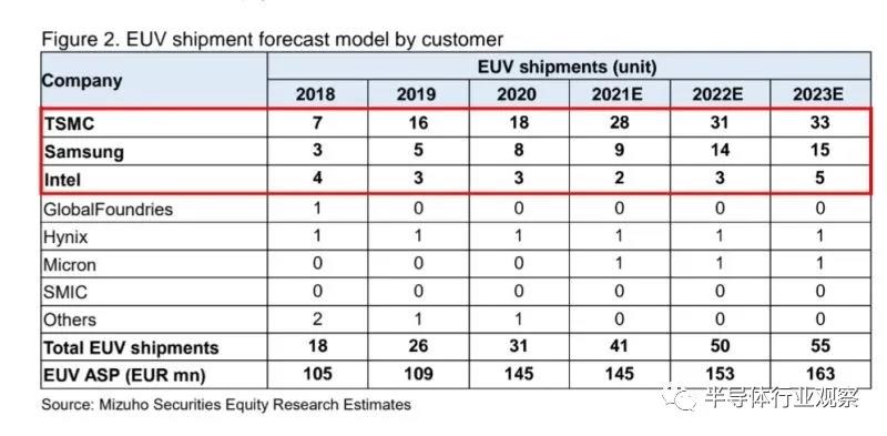 顯然,先進制程芯片龍頭臺積電對EUV光刻機的需求量最大,可以與英特爾做一下比較,到2023年,預(yù)計臺積電共擁有133臺EUV光刻機,而英特爾為20臺。