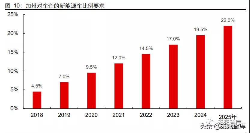 (2)政策法案:加州空氣資源委員會(CARB)于 1990 年首次采用 ZEV 法規(guī)(Zero Emission Vehicle,縮寫 ZEV),ZEV 目的是通過要求汽車制造商銷售一定數(shù)量的清潔 能源汽車來實(shí)現(xiàn)長期減排目標(biāo),其中清潔能源汽車包括純電動汽車、插電混合式汽車、 燃料電池汽車等;最新政策規(guī)定,該比例從 2018 年的 4.5%提升至 2025 年的 22.0%;不同車型對應(yīng)不同的積分,車輛在零排放的狀態(tài)下續(xù)航里程越長,可獲得的積分越高。2013 年 9 月,加州第 8 號議會法案(AB 8)審批通過,該法案確立了空氣質(zhì)量補(bǔ)貼項(xiàng) 目、替代和可再生燃料及車輛技術(shù)項(xiàng)目等;同時,還規(guī)定加州能源委員會每年投入 2000 萬美元資金來支持至少 100 個加氫站的持續(xù)建設(shè);另外,該法案要求加州空氣資源委員 會每年針對燃料電池汽車部署和加氫站網(wǎng)絡(luò)發(fā)展做出年度報告。