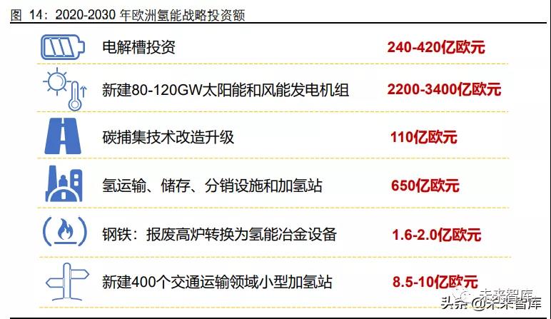 (2)投資計劃:氫能戰(zhàn)略的投資計劃涵蓋制氫、儲運(yùn)氫、加氫的全產(chǎn)業(yè)鏈,以及碳捕集 技術(shù)升級改造、氫能煉鋼等,預(yù)計總投資規(guī)模約 3200-4600 億歐元。