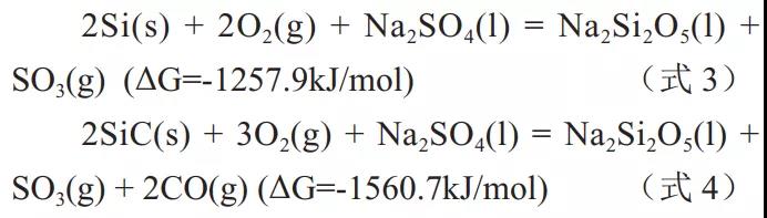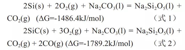圖 2 為在 900℃ Na2CO3 和 Na2SO4 熔鹽中處理 4 h 的 SiC 陶瓷的 XRD 圖譜??梢钥闯觯?兩種熔鹽腐蝕后, SiC 陶瓷的相組成是相同的, 主要是由 SiC 和 Si 以及少量 Na2Si2O5 組成。其中,Na2SO4 熔鹽腐蝕樣品的硅含量明顯多于 Na2CO3熔鹽腐蝕樣品的硅含量。SiC 陶瓷中的 Si 相主要來(lái)源于其制備過(guò)程中填充到孔隙的游離硅 。熔鹽腐蝕過(guò)程中, 可能發(fā)生的化學(xué)反應(yīng)包括: