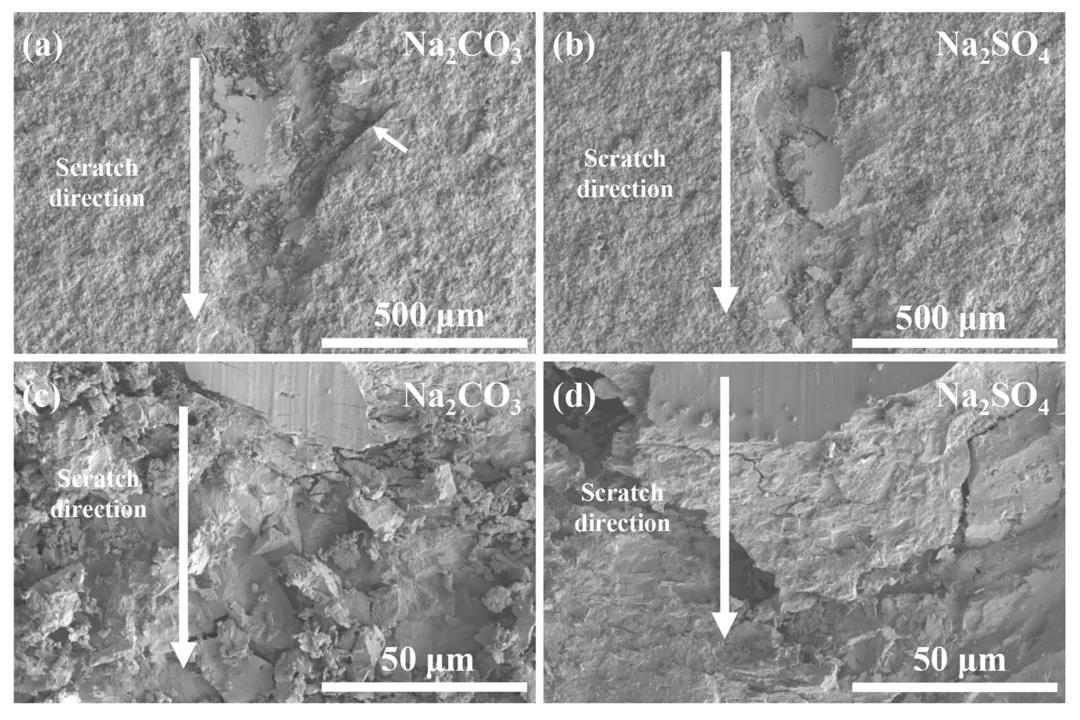 為了進(jìn)一步驗(yàn)證涂層 - 基體間的界面結(jié)合性能, 考察涂層 - 基體界面的劃痕性能、 壓痕性能和拉伸結(jié)合性能。圖 4 為在 900℃ 熔鹽中處理 4h 的 SiC 陶瓷表面制備的 Si 涂層的劃痕形貌。進(jìn)行劃痕實(shí)驗(yàn)前, 用細(xì)砂紙把涂層磨薄至 20~50μm,以觀察界面結(jié)合性。從低倍形貌( 圖 4(a)和 4(b))可以看出,Na2CO3 熔鹽處理的 Si 涂層劃痕形貌較深, 并且劃痕處涂層剝落現(xiàn)象明顯;而 Na2SO4 熔鹽腐蝕試樣的劃痕深度較淺,未見(jiàn)劃痕處有明顯的涂層剝落現(xiàn)象。從高倍形貌(圖4(c) 和4(d))可以看出, Na2CO3 熔鹽腐蝕試樣的涂層碎裂現(xiàn)象明顯,在劃痕處存在大量的碎屑,而 Na2SO4 熔鹽腐蝕試樣的內(nèi)部顆粒呈現(xiàn)階梯狀碎裂, 且未發(fā)現(xiàn)明顯的碎屑分布在劃痕處。